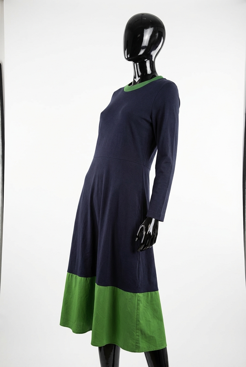 a glossy black plastic mannequin with no facial features in Cos Navy Long Sleeve Dress Size Large arching their back slightly for a dynamic pose, in a clean photo studio with seamless white backdrop and softbox lighting.