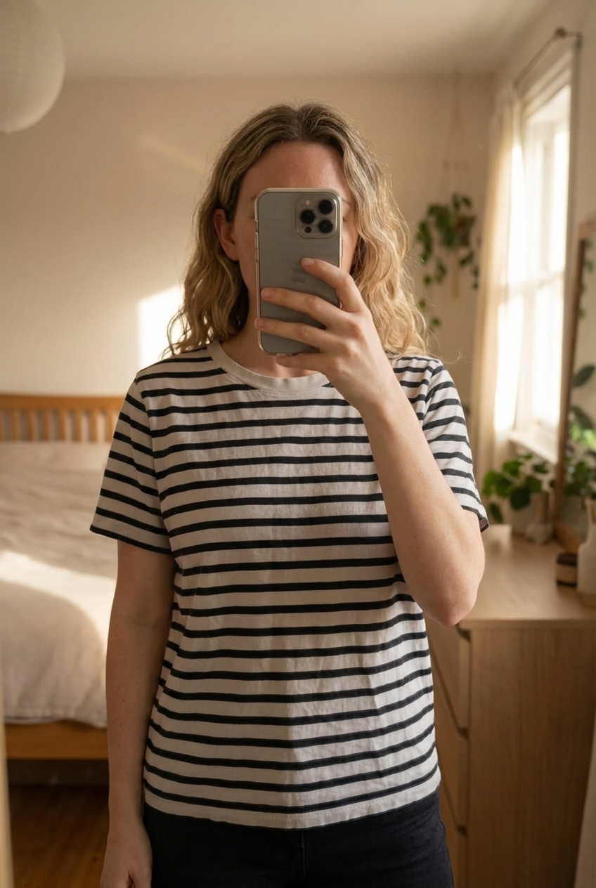 COS oversized T-shirt standing straight facing the camera, in a softly lit bedroom setting, with gentle natural light filtering through a window.