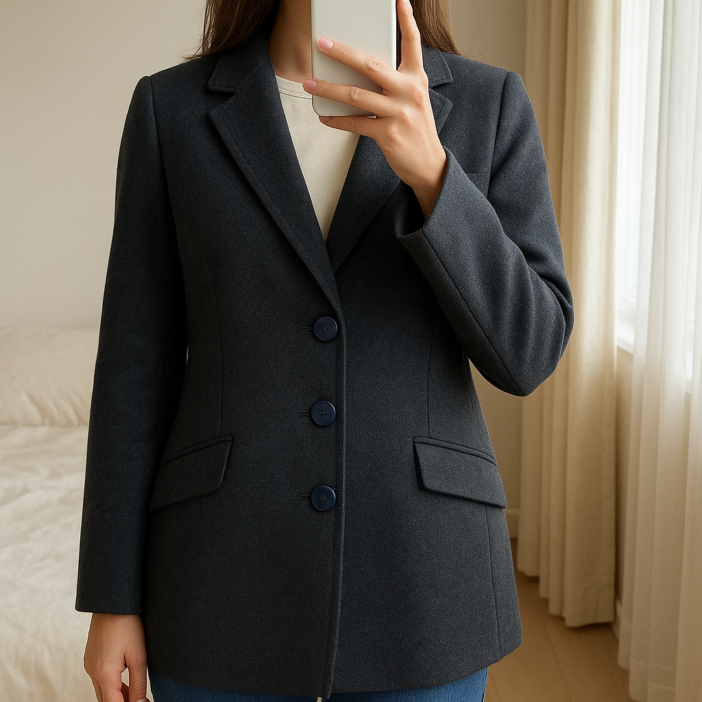 Covent Garden London Women's Tailored Charcoal Pea Coat - Size 12 standing straight facing the camera, in a softly lit bedroom setting, with gentle natural light filtering through a window.
