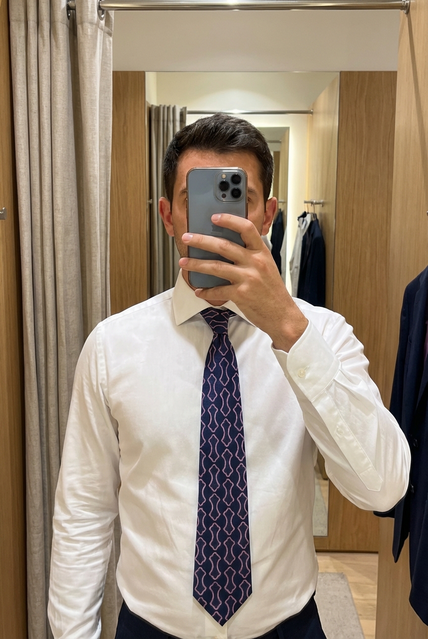 Una persona in Cravatta vintage – Made in Italy 🇮🇹 in piedi, rivolto verso la fotocamera, in un camerino in stile boutique con specchio e decorazioni neutre.