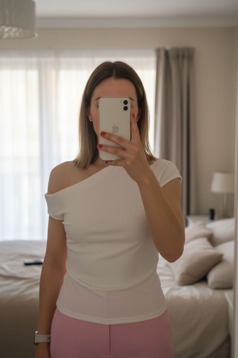 Cream asymmetric top standing straight facing the camera, in a softly lit bedroom setting, with gentle natural light filtering through a window.