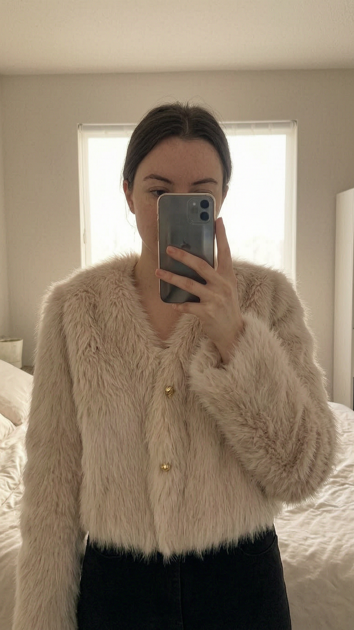 Cream Faux Fur Cropped Jacket – Size 10 – Gold Button Detail – Occasionwea standing straight facing the camera, in a softly lit bedroom setting, with gentle natural light filtering through a window.