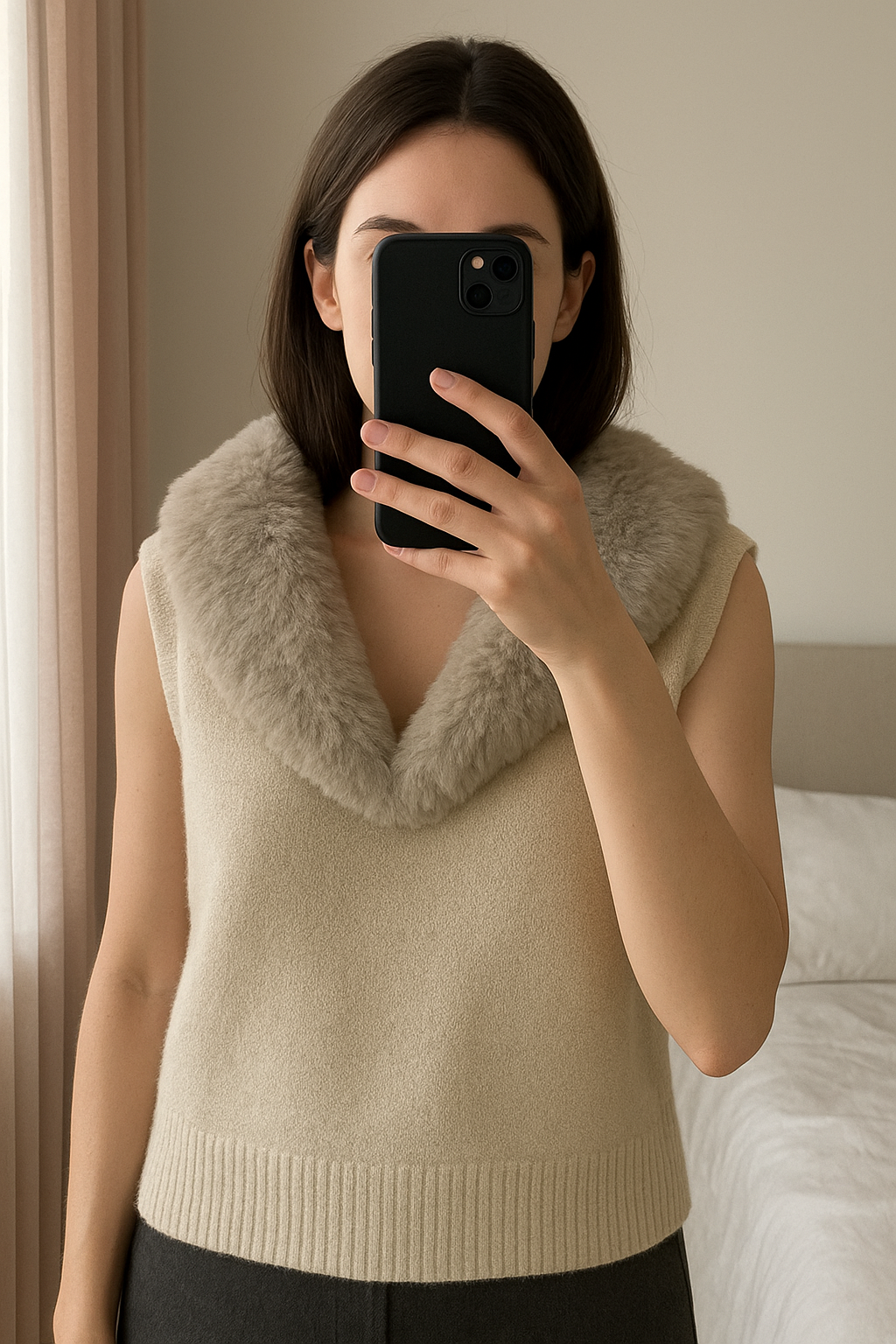 Cream fur gilet standing straight facing the camera, in a softly lit bedroom setting, with gentle natural light filtering through a window.