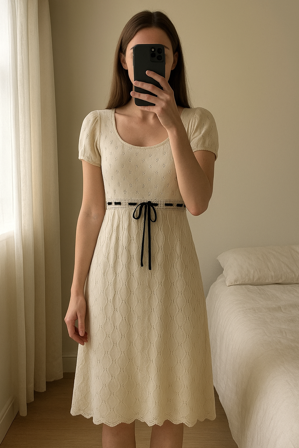 Cream Oasis knit dress, size 12 standing straight facing the camera, in a softly lit bedroom setting, with gentle natural light filtering through a window.