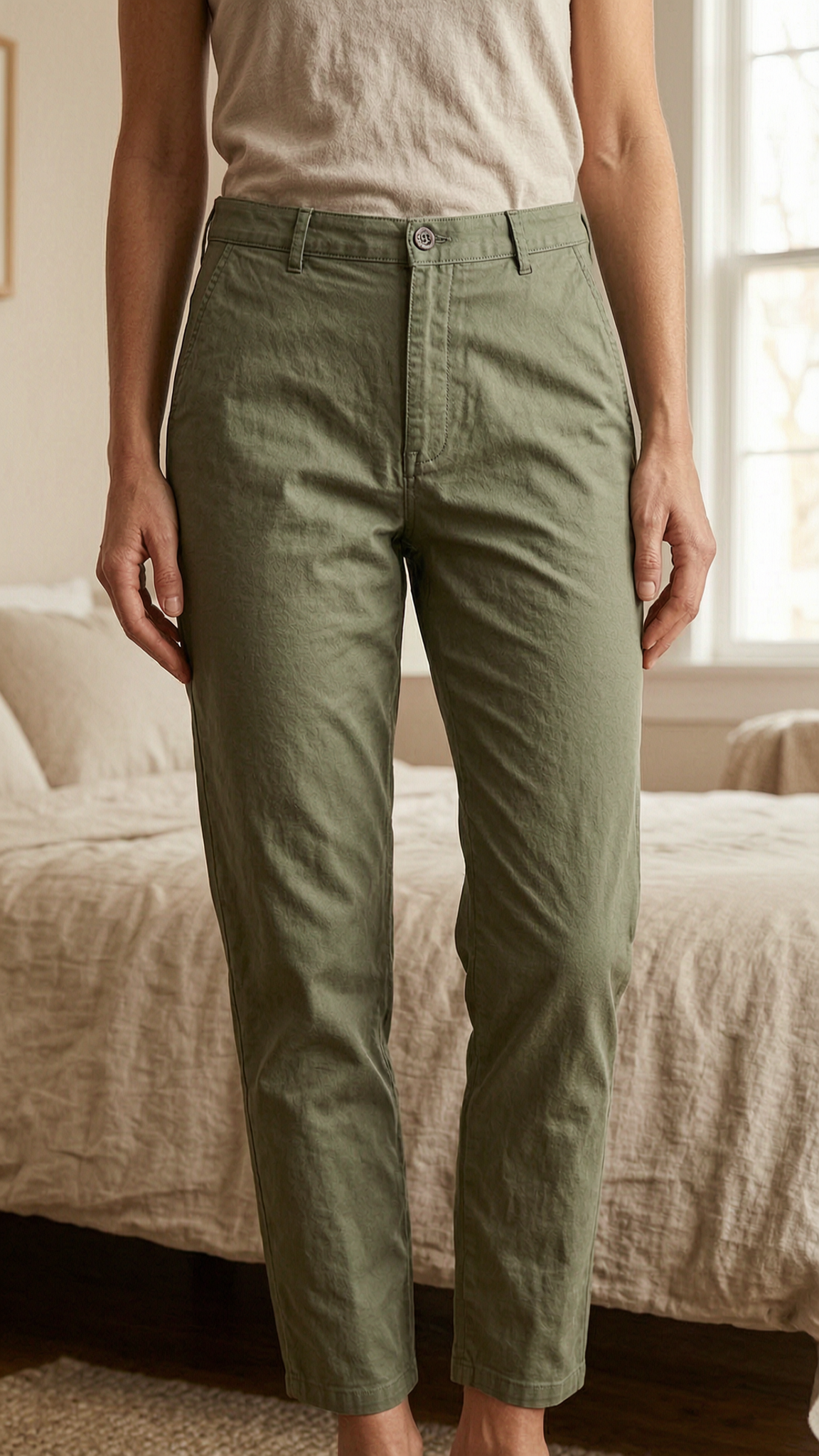 Crew Clothing Company Green Cotton Trousers - size 16 standing straight facing the camera, in a softly lit bedroom setting, with gentle natural light filtering through a window.