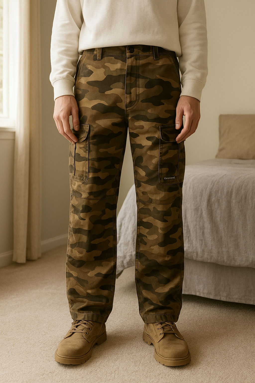 Criminal Damage Lattice Camo BNWT 26” standing straight facing the camera, in a softly lit bedroom setting, with gentle natural light filtering through a window.