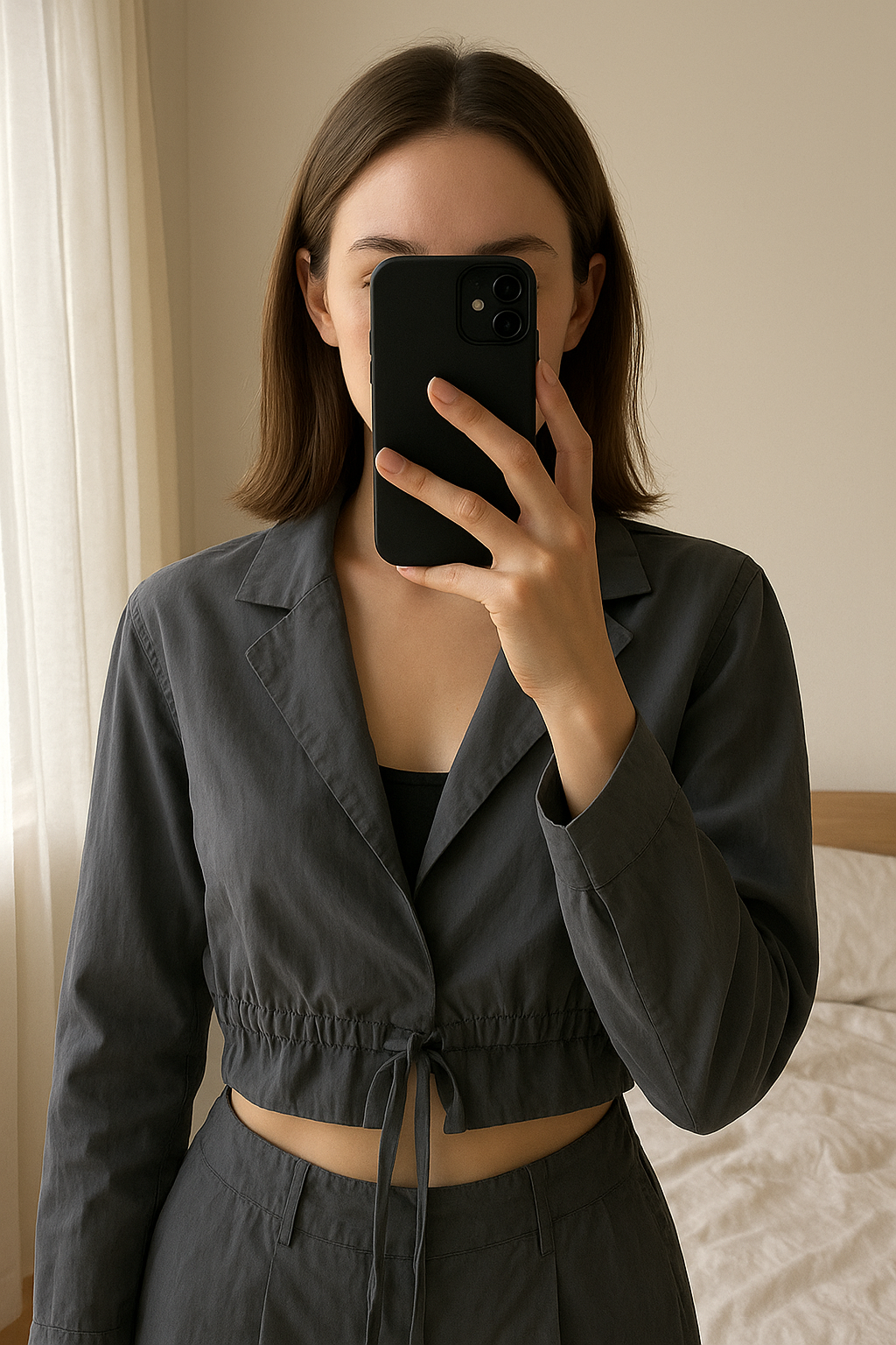 Cropped wrap shirt NA-KD grey standing straight facing the camera, in a softly lit bedroom setting, with gentle natural light filtering through a window.