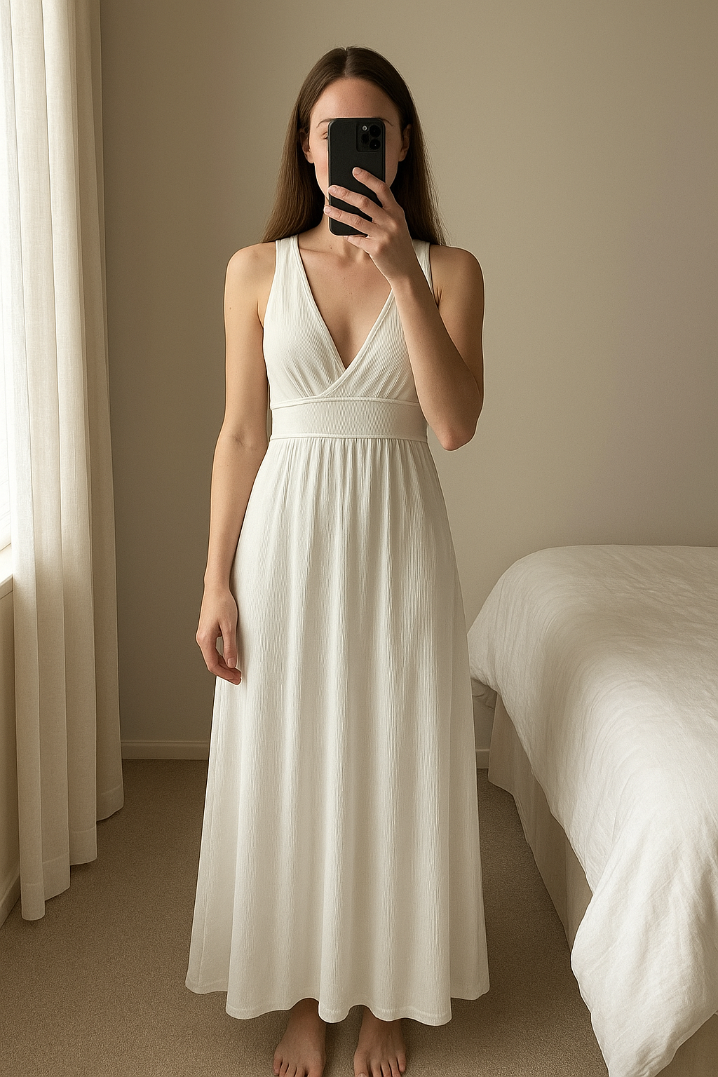 Cross back White dress standing straight facing the camera, in a softly lit bedroom setting, with gentle natural light filtering through a window.