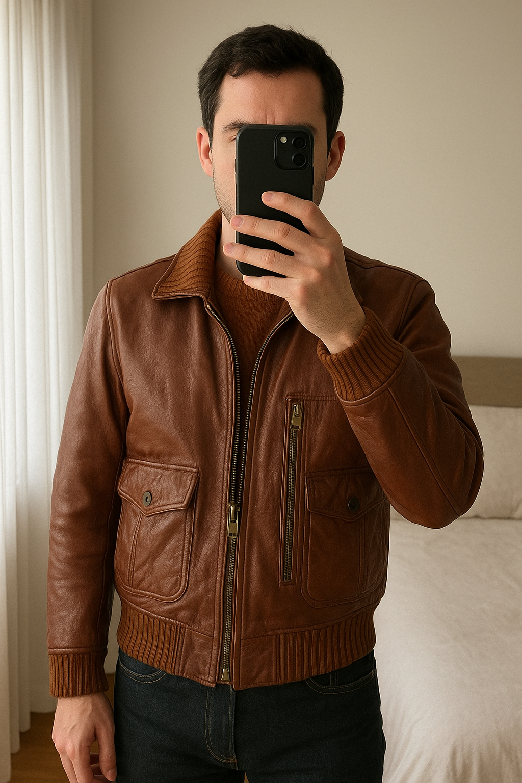 cuir homme gucci madonna taille 48 debout, face à la caméra, dans une chambre à la lumière douce, avec une lumière naturelle filtrant par la fenêtre.