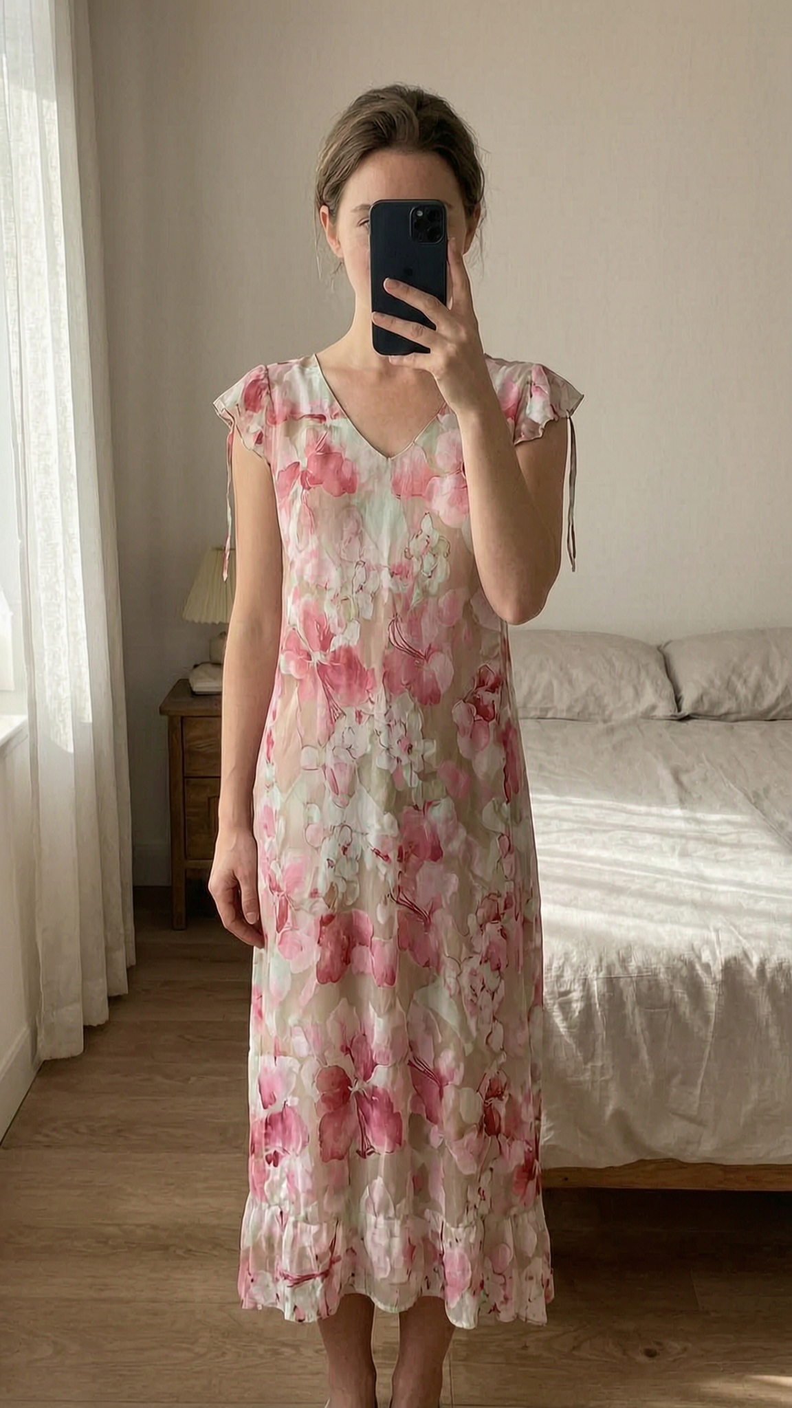 Cute fairy floral vintage 90s dress standing straight facing the camera, in a softly lit bedroom setting, with gentle natural light filtering through a window.