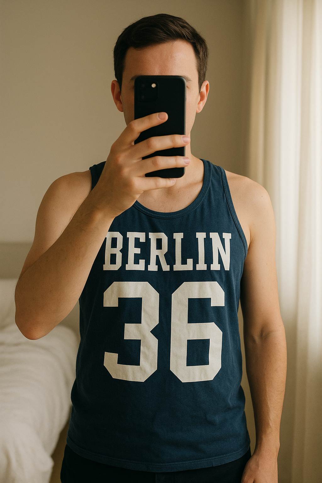 Débardeur debout, face à la caméra, dans une chambre à la lumière douce, avec une lumière naturelle filtrant par la fenêtre.