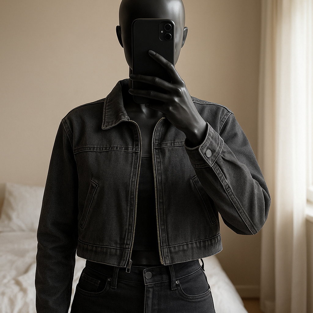 a glossy black plastic mannequin with no facial features in Džinsová bunda standing straight facing the camera, with a slim body type, in a softly lit bedroom setting, with gentle natural light filtering through a window.