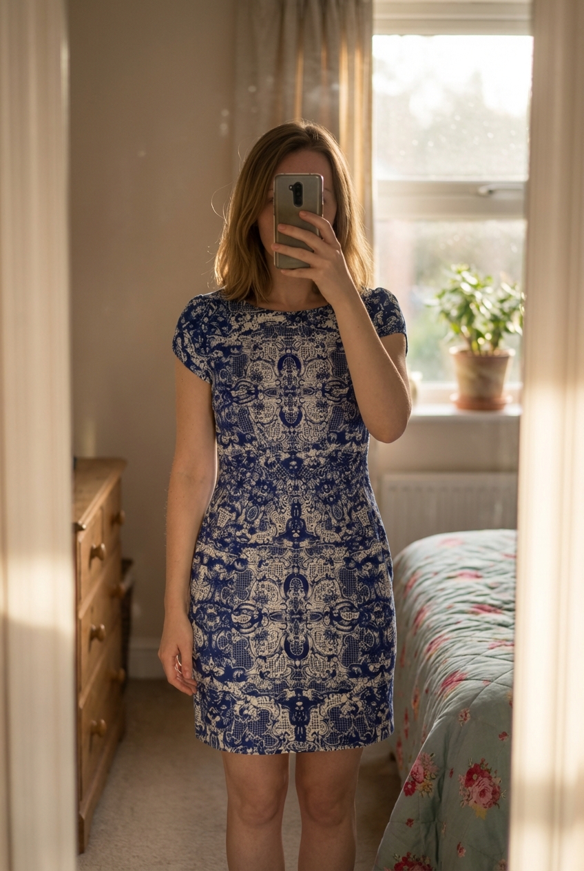 Darling London Sleeveless Blue & White Dress UK 12 standing straight facing the camera, in a softly lit bedroom setting, with gentle natural light filtering through a window.