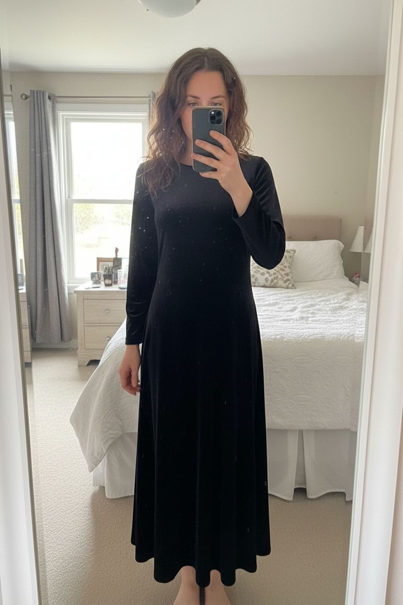 Dazzle in Darkness: Feather and Bone’s Chic Black Velour Dress! standing straight facing the camera, in a softly lit bedroom setting, with gentle natural light filtering through a window.