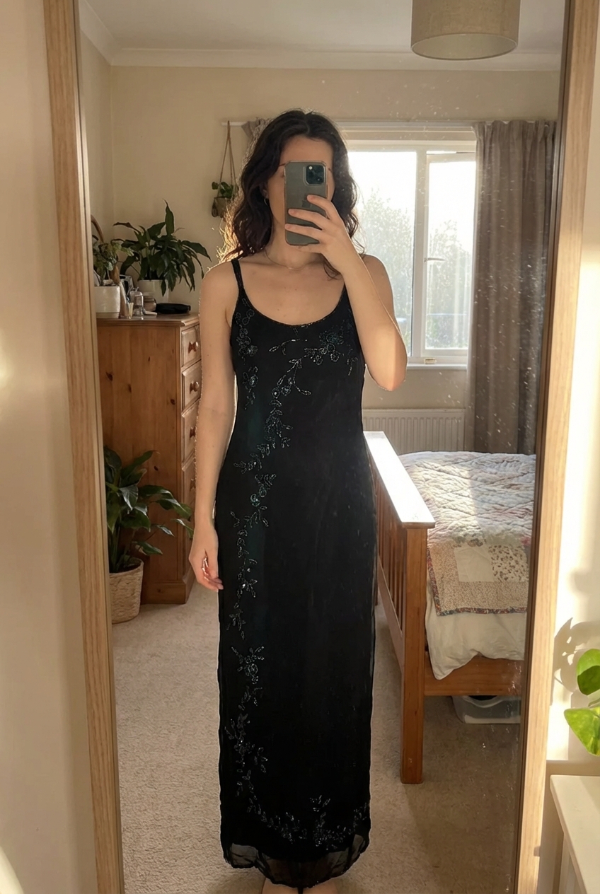 Debenhams Debut Black Beaded Slip Dress standing straight facing the camera, in a softly lit bedroom setting, with gentle natural light filtering through a window.