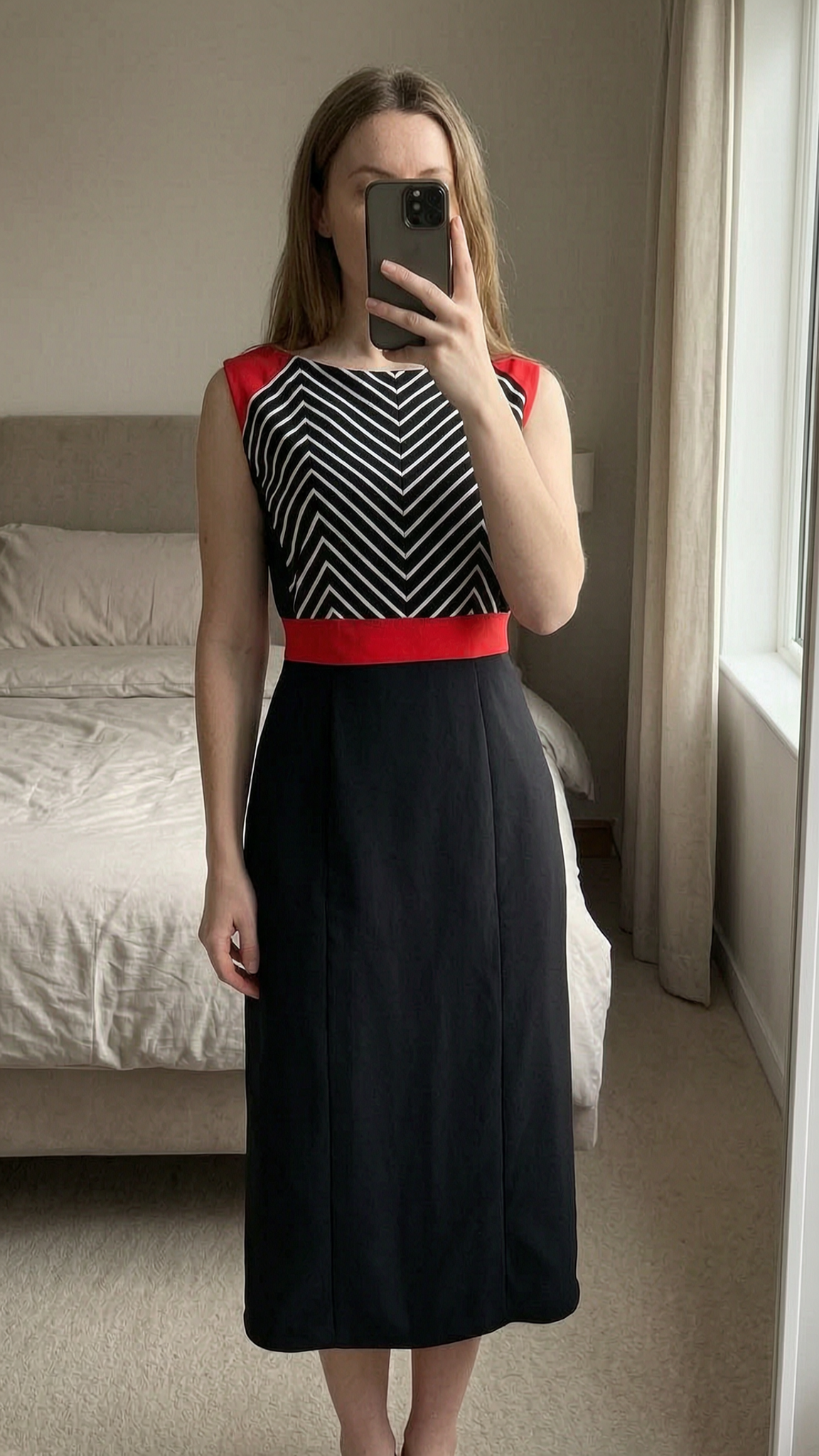 A person in Debenhams Petite Collection sleeveless shift dress full lined size 10 standing straight facing the camera, in a softly lit bedroom setting, with gentle natural light filtering through a window.