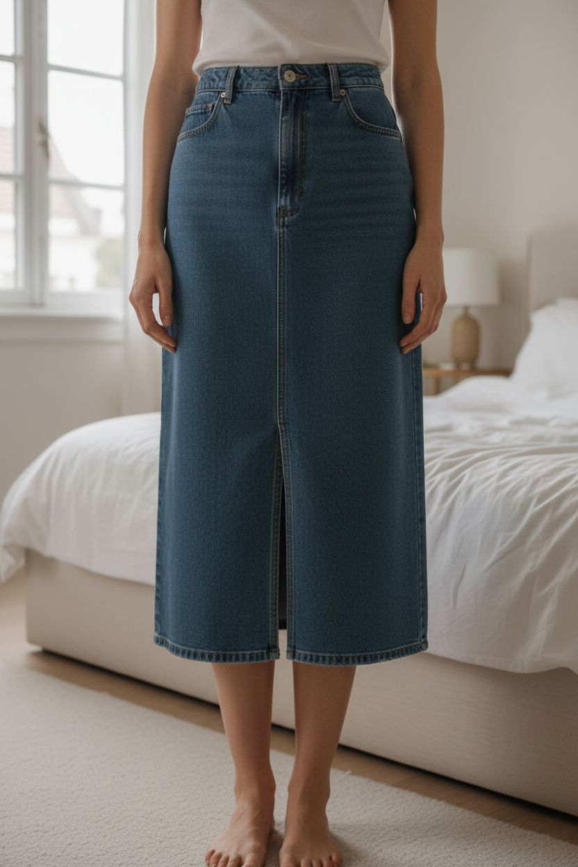 Denim midi skirt standing straight facing the camera, in a softly lit bedroom setting, with gentle natural light filtering through a window.