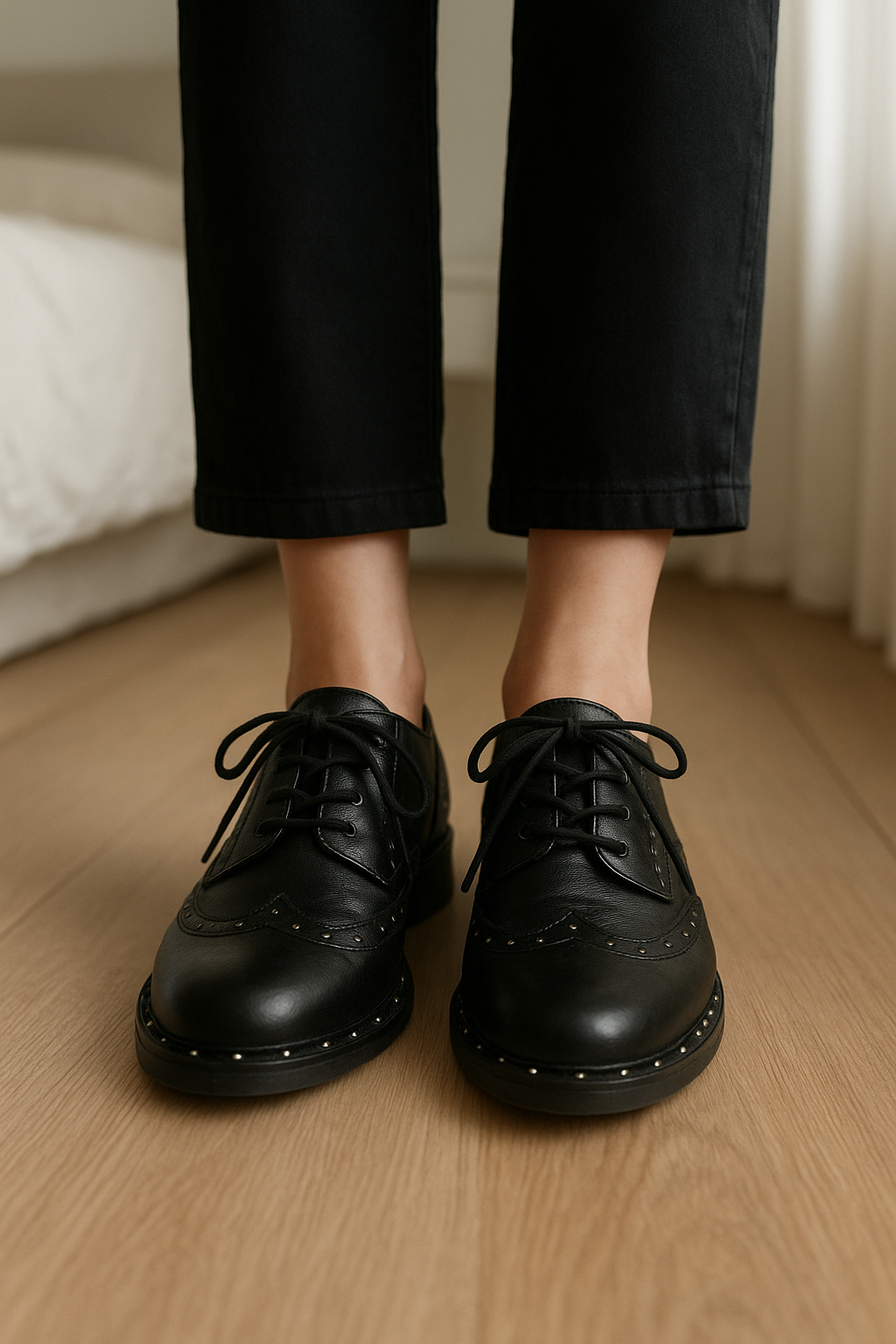 Derbies en cuir noir cloutées 39 - francesina mocassini donna 39 in piedi, rivolto verso la fotocamera, in una camera da letto con luce soffusa e luce naturale che filtra dalla finestra.