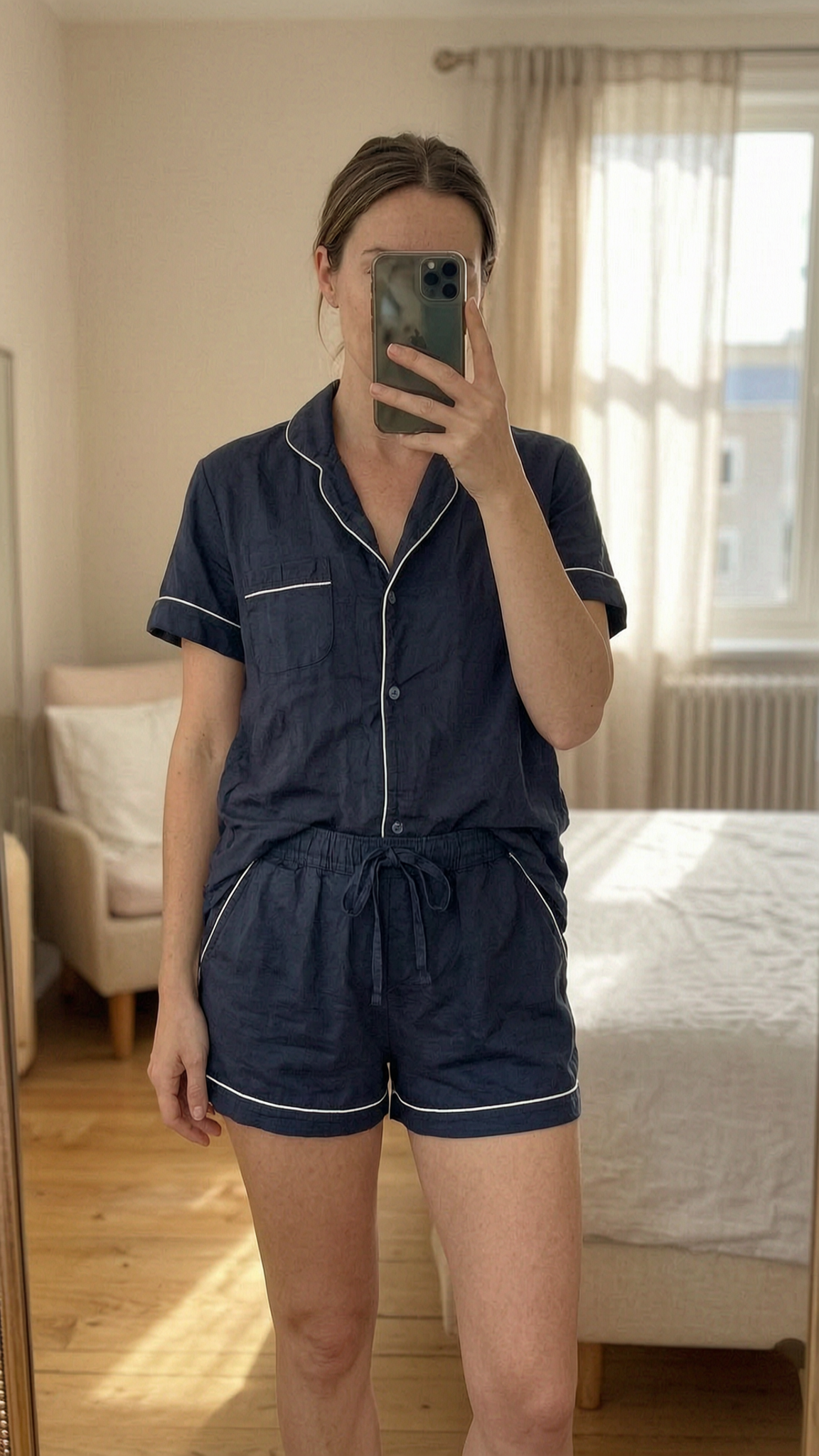 Desmond & Dempsey medium pjs standing straight facing the camera, in a softly lit bedroom setting, with gentle natural light filtering through a window.