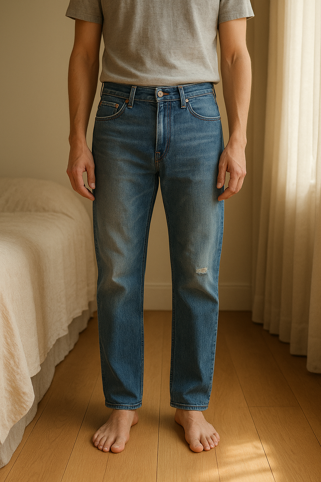 Diesel Jeans W28 L 30 standing straight facing the camera, in a softly lit bedroom setting, with gentle natural light filtering through a window.