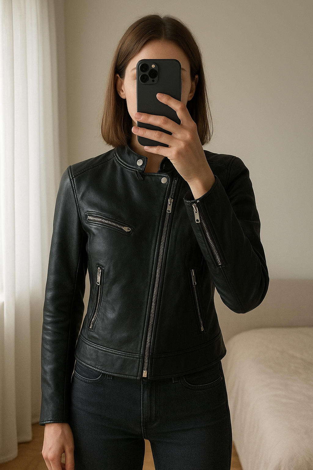 Dirbtinės odos striukė standing straight facing the camera, in a softly lit bedroom setting, with gentle natural light filtering through a window.