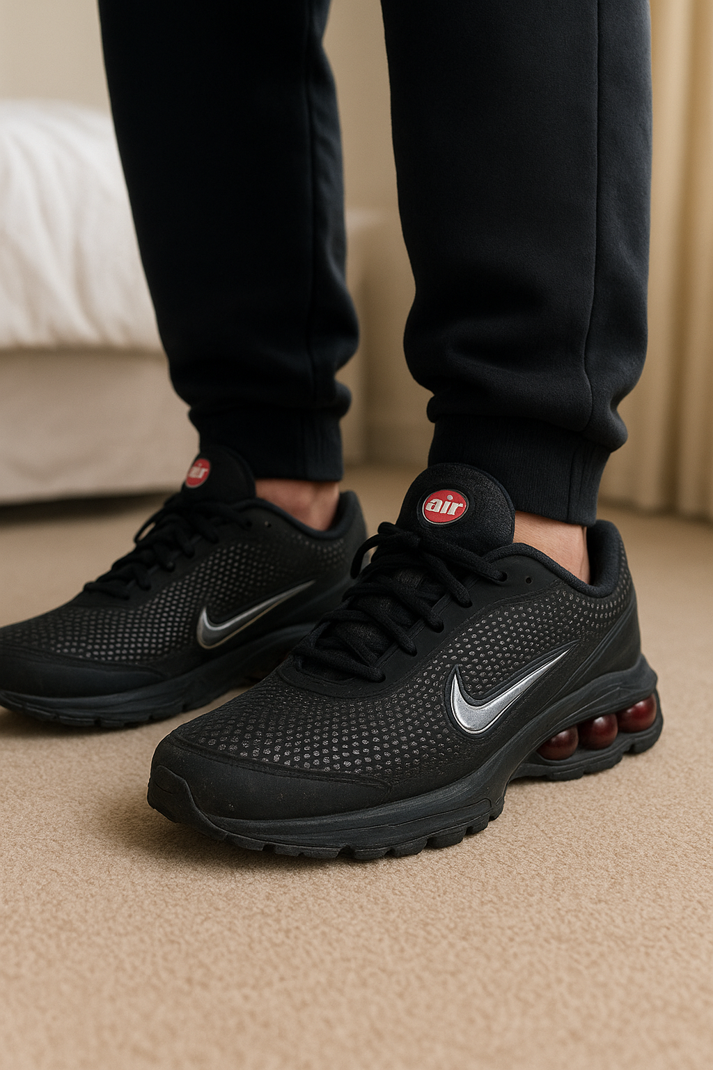 Dn Nike air max noir, rouge et grise debout, face à la caméra, dans une chambre à la lumière douce, avec une lumière naturelle filtrant par la fenêtre.
