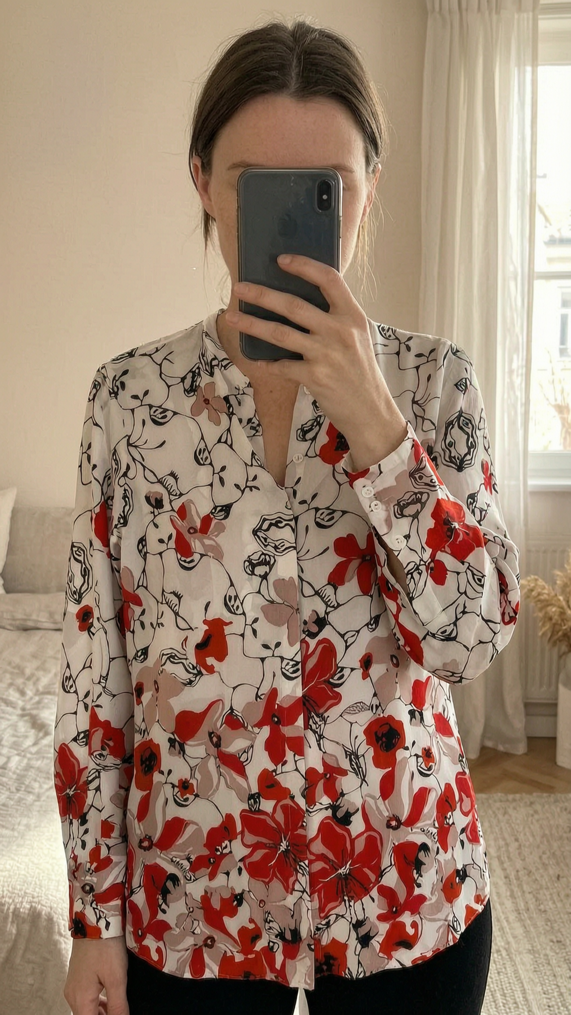 Dorothee Schumacher pure silk floral blouse standing straight facing the camera, in a softly lit bedroom setting, with gentle natural light filtering through a window.