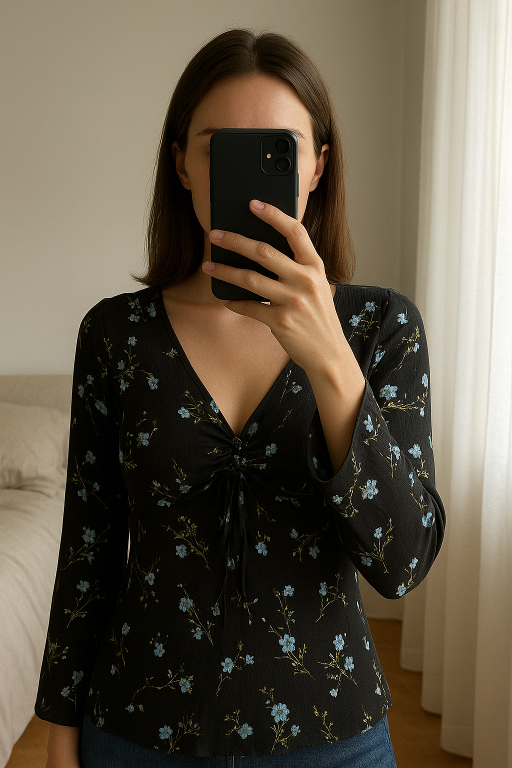 Dorothy Perkins floaty top with detail at bust, size 18 standing straight facing the camera, in a softly lit bedroom setting, with gentle natural light filtering through a window.