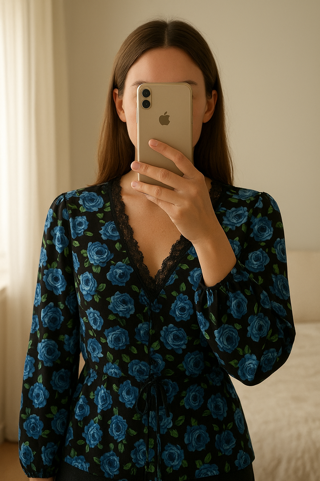 Dorothy Perkins new with tag pretty floral top with lace neck, tie back and full sleeves. Size 18 standing straight facing the camera, in a softly lit bedroom setting, with gentle natural light filtering through a window.