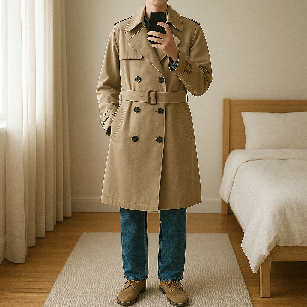 Double breasted trench coat size XS standing straight facing the camera, in a softly lit bedroom setting, with gentle natural light filtering through a window.