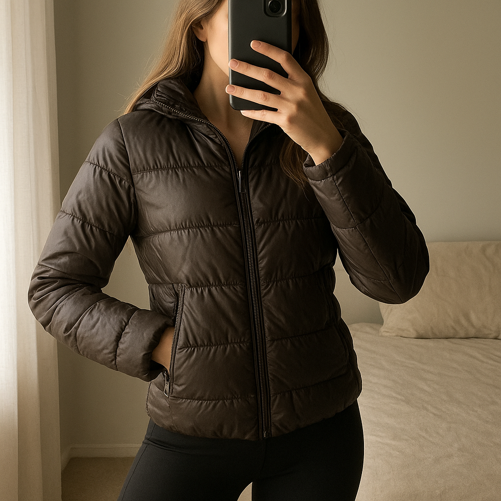 Une personne en Doudoune femme taille M cambrant légèrement le dos pour une pose dynamique, avec une silhouette fine, dans une chambre à la lumière douce, avec une lumière naturelle filtrant par la fenêtre.