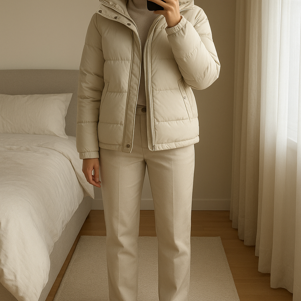 Doudoune hiver chaude debout, face à la caméra, dans une chambre à la lumière douce, avec une lumière naturelle filtrant par la fenêtre.