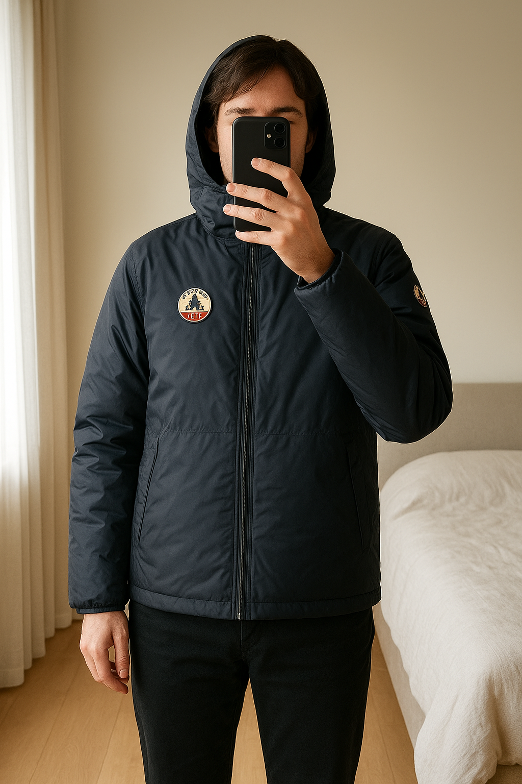 Doudoune Jott debout, face à la caméra, dans une chambre à la lumière douce, avec une lumière naturelle filtrant par la fenêtre.