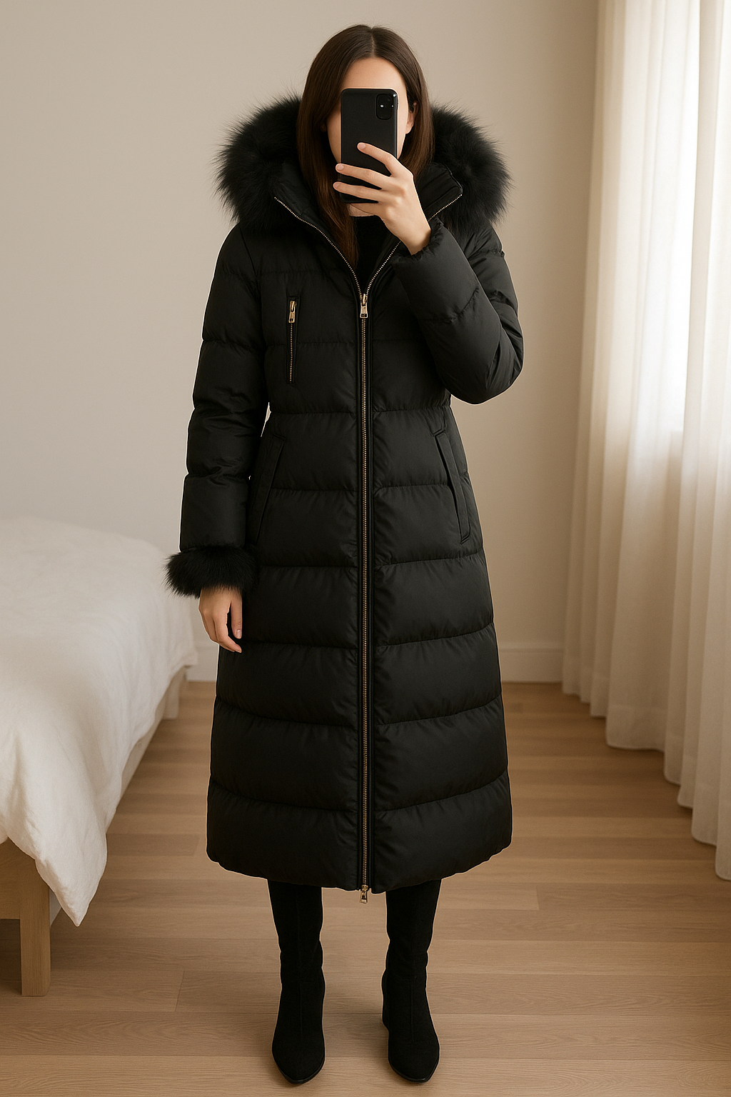 Doudoune Liu Jo en plume debout, face à la caméra, dans une chambre à la lumière douce, avec une lumière naturelle filtrant par la fenêtre.