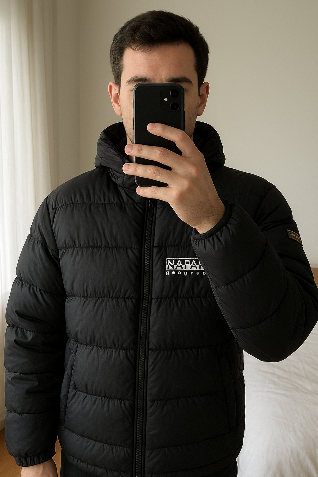 Doudoune Napajiri debout, face à la caméra, dans une chambre à la lumière douce, avec une lumière naturelle filtrant par la fenêtre.