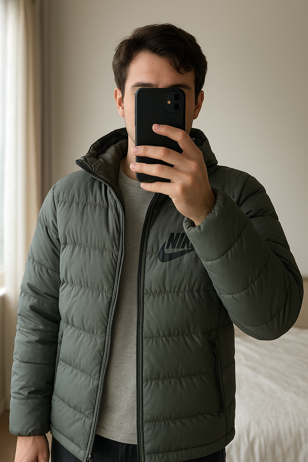doudoune nike debout, face à la caméra, dans une chambre à la lumière douce, avec une lumière naturelle filtrant par la fenêtre.