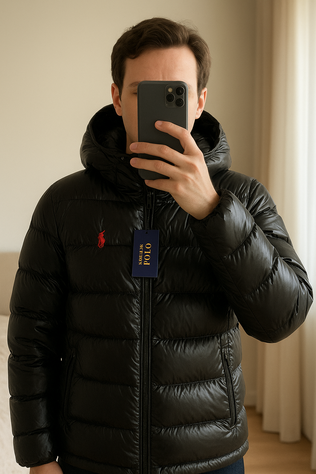 Doudoune Polo Ralph Lauren noire brillante debout, face à la caméra, dans une chambre à la lumière douce, avec une lumière naturelle filtrant par la fenêtre.