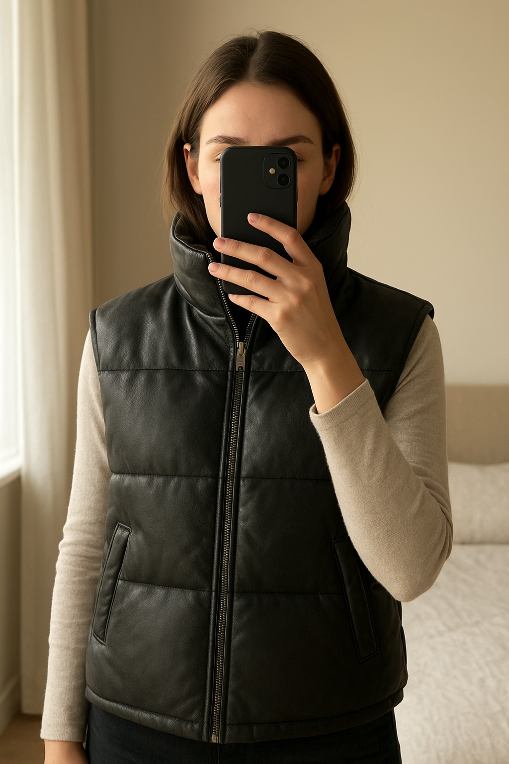 Doudoune sans manches Zara cuir debout, face à la caméra, dans une chambre à la lumière douce, avec une lumière naturelle filtrant par la fenêtre.