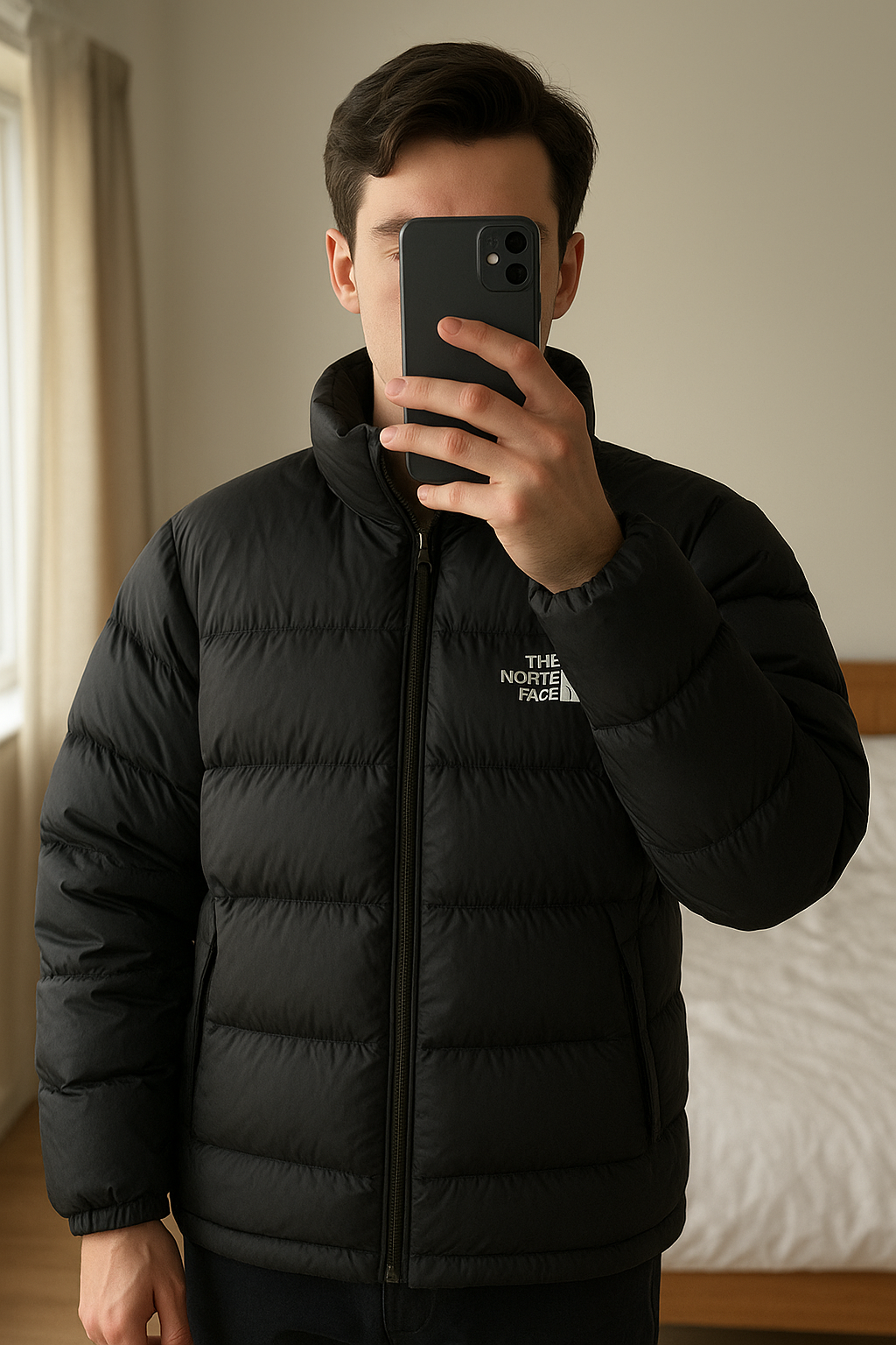 doudoune the north face debout, face à la caméra, dans une chambre à la lumière douce, avec une lumière naturelle filtrant par la fenêtre.
