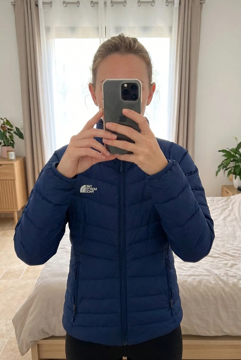 Doudoune The North Face femme bleue marine debout, face à la caméra, dans une chambre à la lumière douce, avec une lumière naturelle filtrant par la fenêtre.