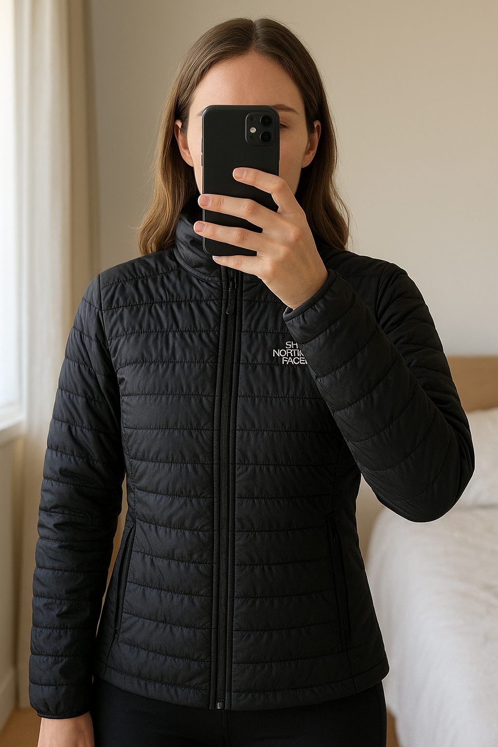 Doudoune The North Face neuf debout, face à la caméra, dans une chambre à la lumière douce, avec une lumière naturelle filtrant par la fenêtre.
