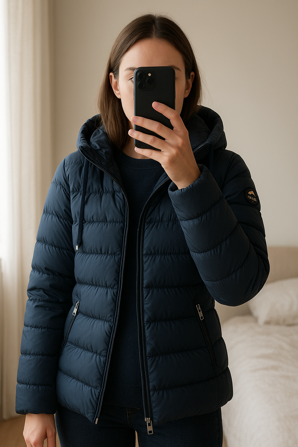 Doudoune Tokyo Laundry taille M debout, face à la caméra, dans une chambre à la lumière douce, avec une lumière naturelle filtrant par la fenêtre.