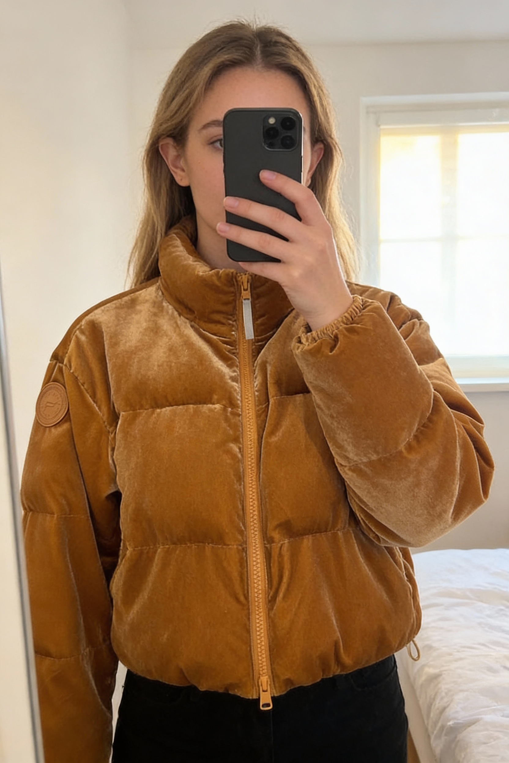 Doudoune velours femme debout, face à la caméra, dans une chambre à la lumière douce, avec une lumière naturelle filtrant par la fenêtre.