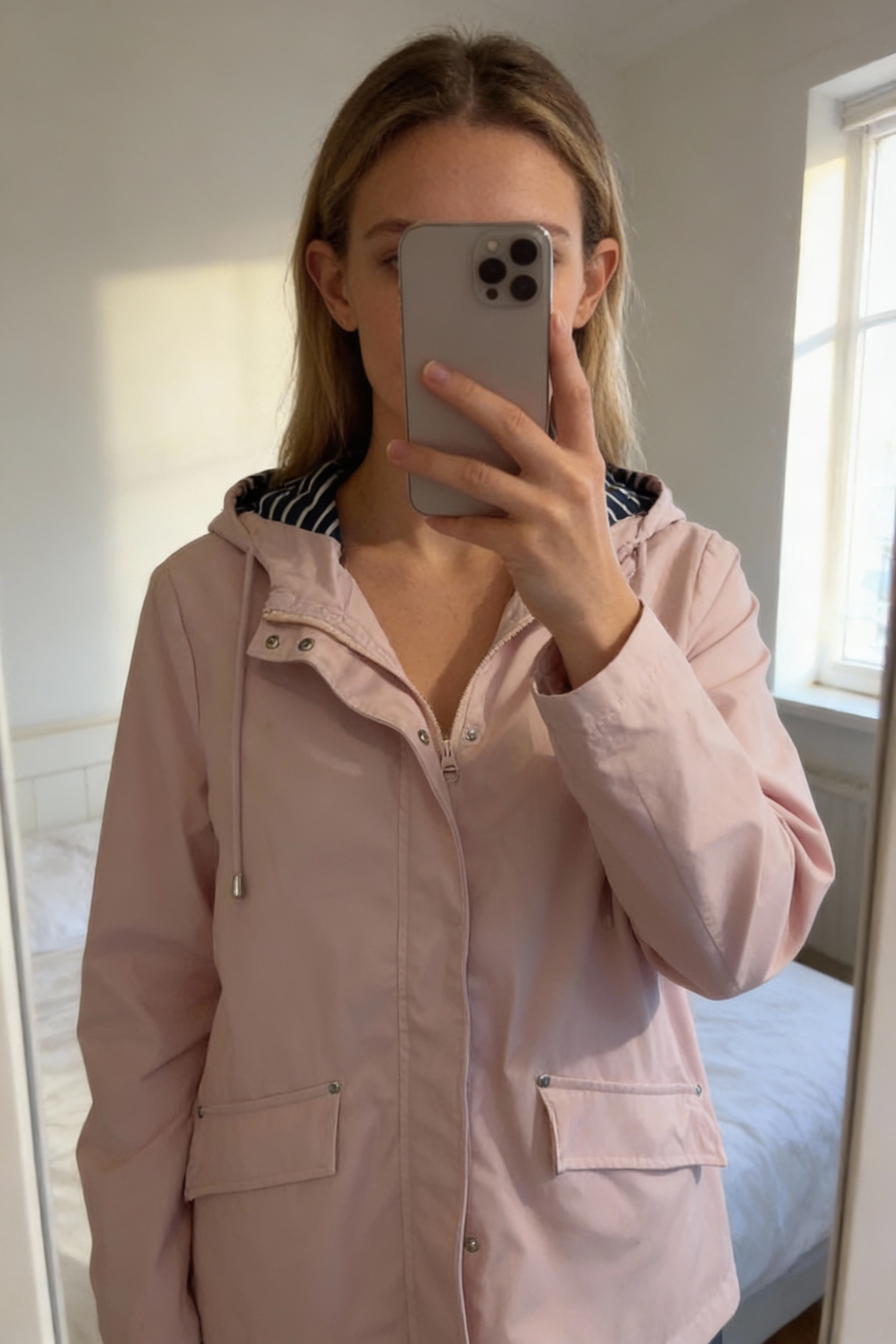 Dunnes Stores Ladies raincoat size 13 standing straight facing the camera, in a softly lit bedroom setting, with gentle natural light filtering through a window.