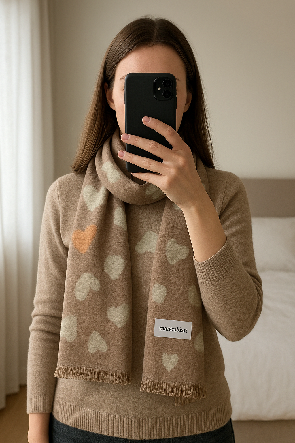 Echarpe manoukian neuve avec étiquette debout, face à la caméra, dans une chambre à la lumière douce, avec une lumière naturelle filtrant par la fenêtre.