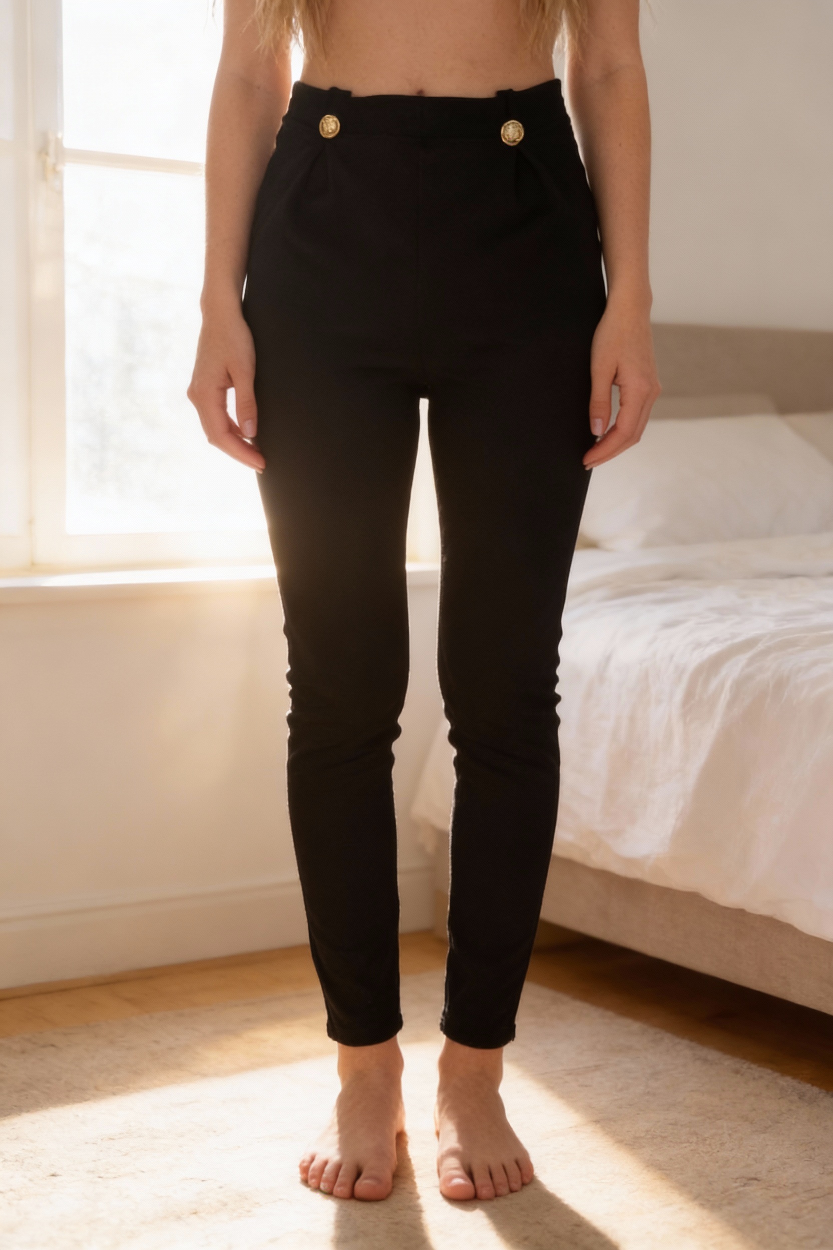 elegáns leggings standing straight facing the camera, in a softly lit bedroom setting, with gentle natural light filtering through a window.
