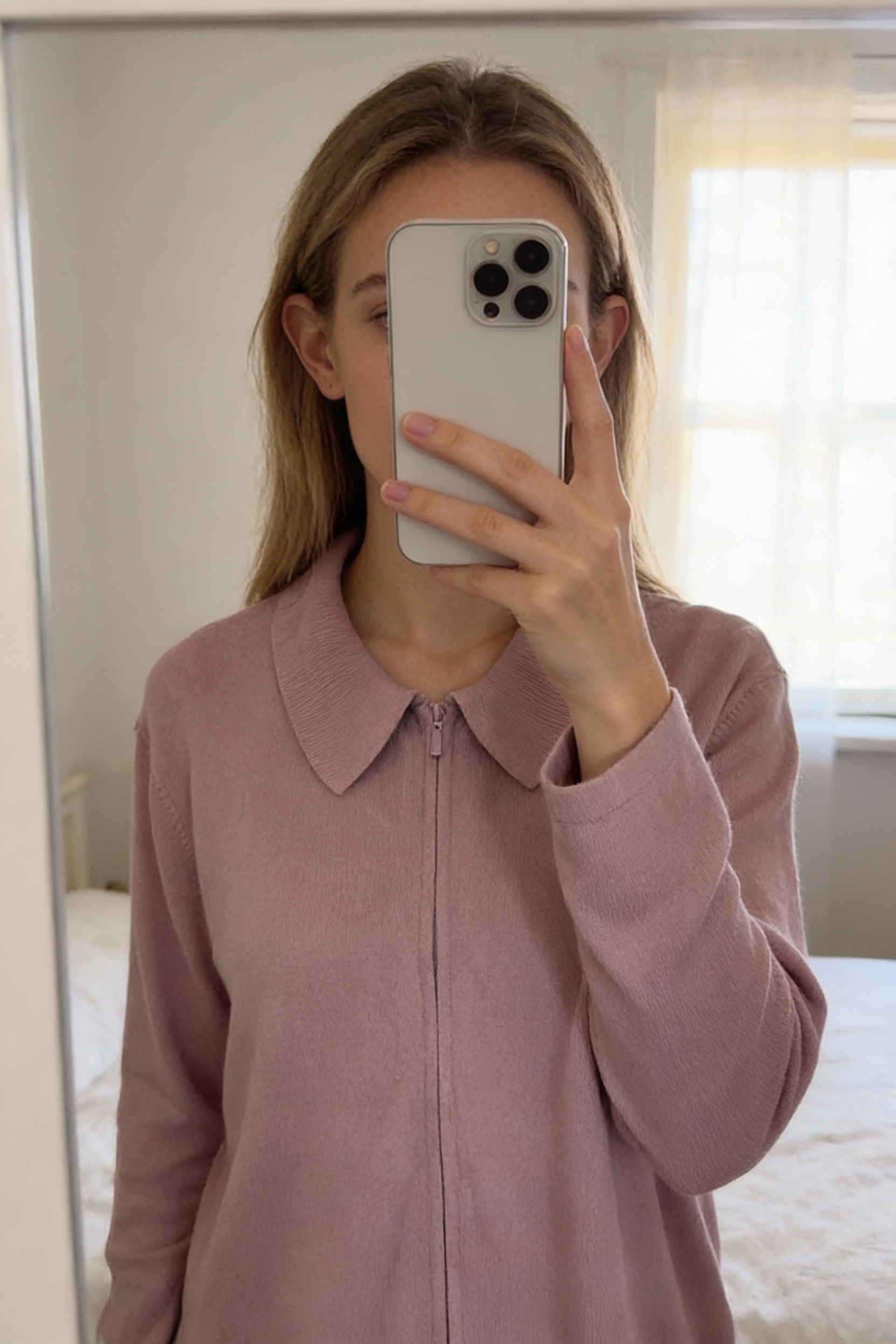 Elvi Pink Zip Front Cardigan Size 3 standing straight facing the camera, in a softly lit bedroom setting, with gentle natural light filtering through a window.