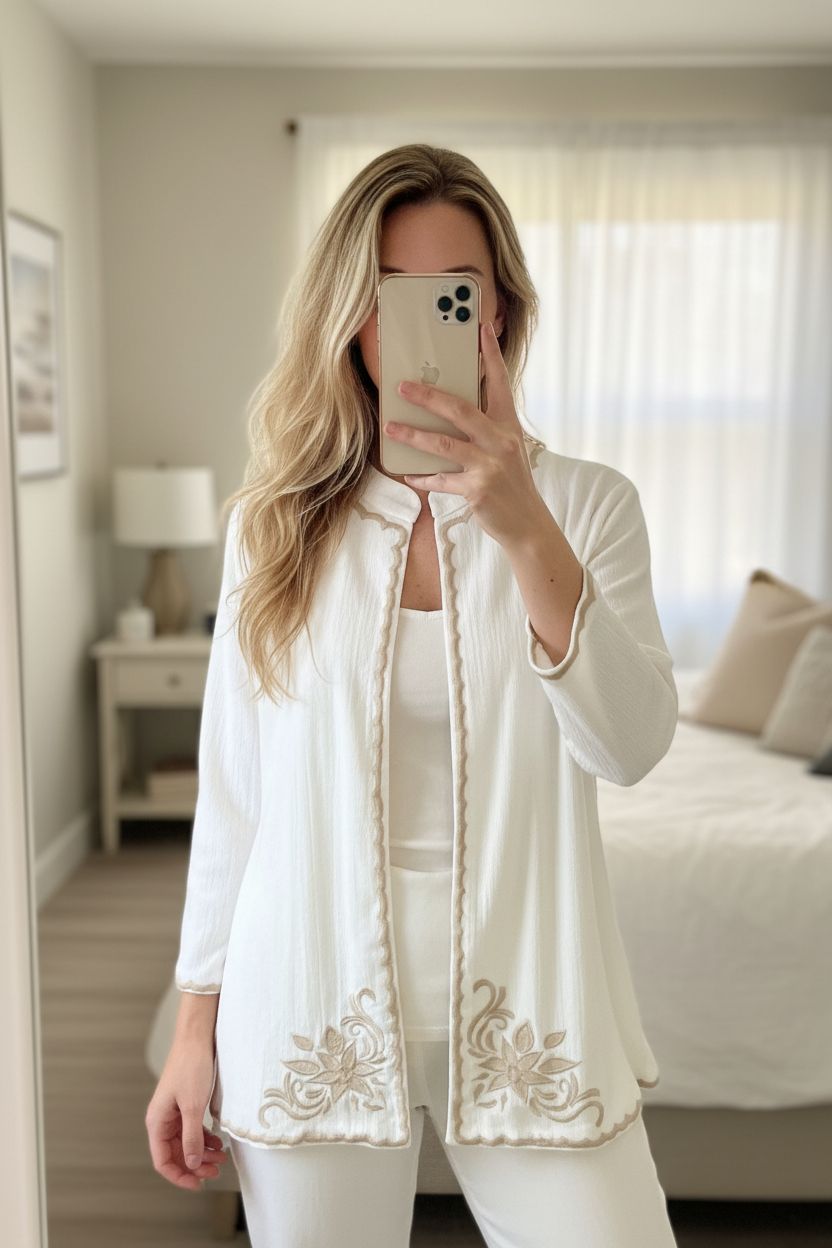 Embroidered Boho Jacket Cardigan Cream Gold Festival Kimono UK16 summer holiday cover up standing straight facing the camera, in a softly lit bedroom setting, with gentle natural light filtering through a window.
