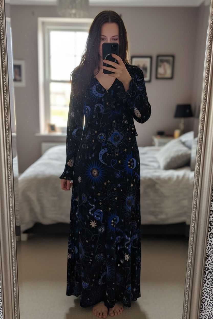 Enchanting Spellbound Witchy Dress – Size 8 standing straight facing the camera, in a softly lit bedroom setting, with gentle natural light filtering through a window.