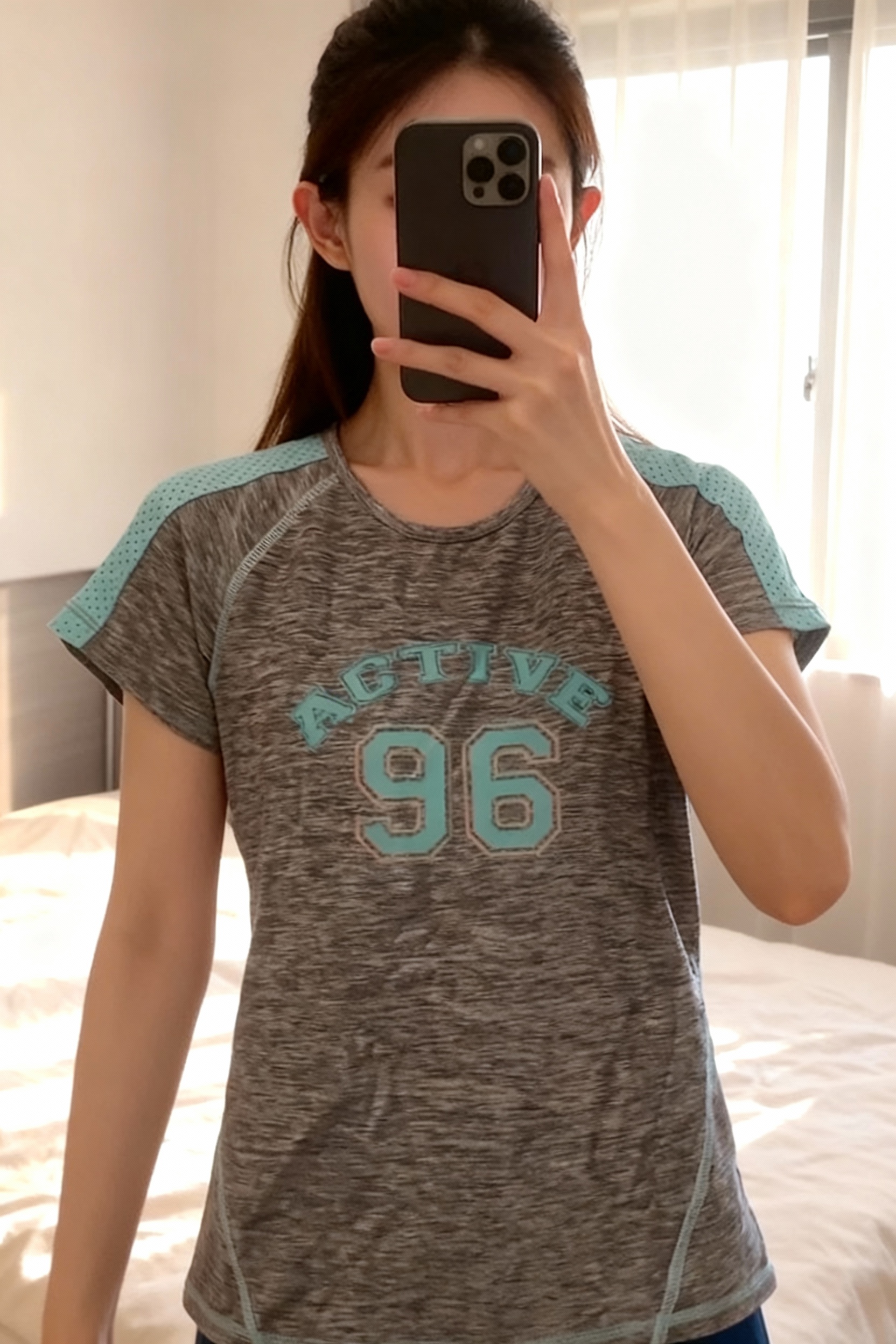 Ensemble de sport debout, face à la caméra, dans une chambre à la lumière douce, avec une lumière naturelle filtrant par la fenêtre.